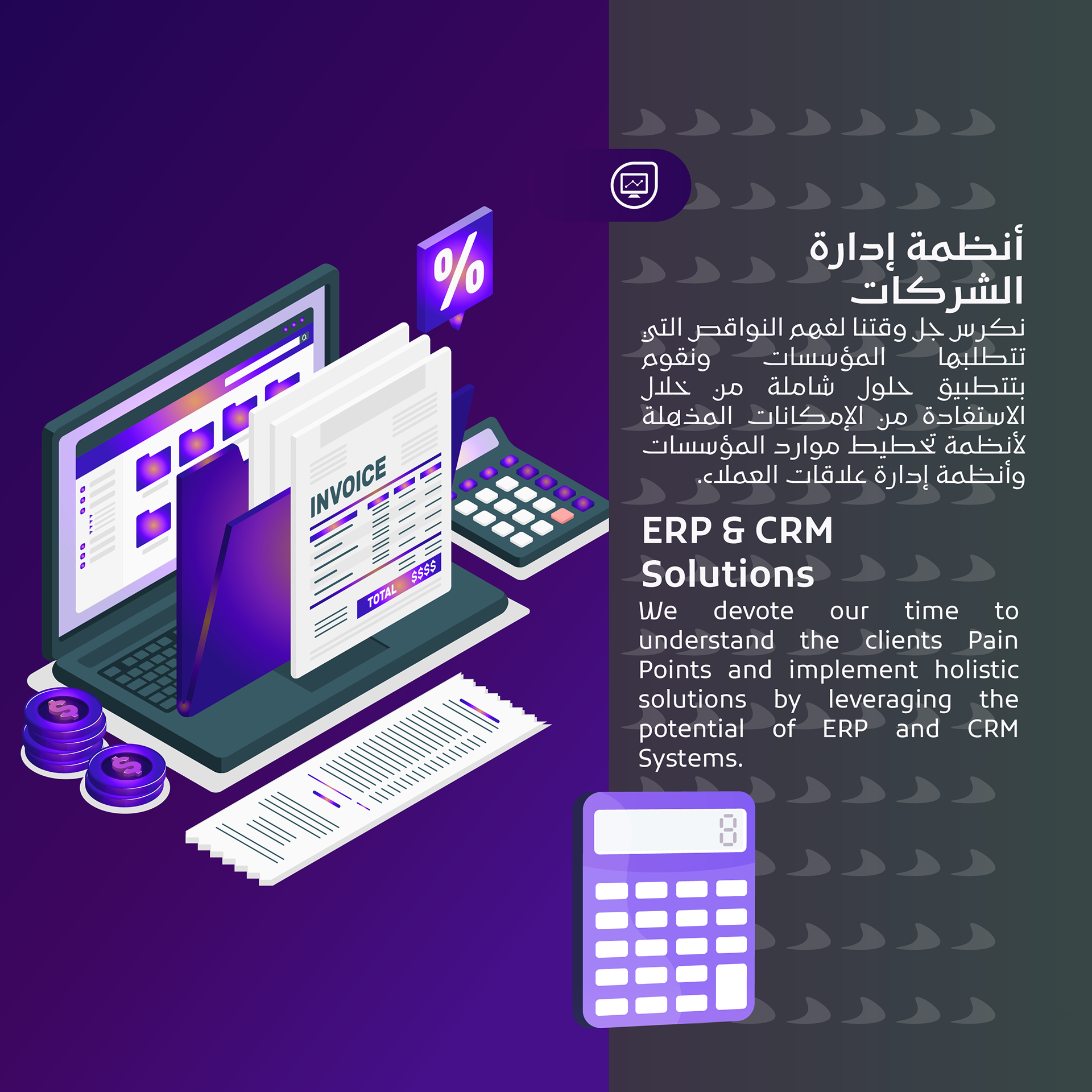 نقدم أنظمة حلول للشركات و المؤسسات الصغيرة و المتوسطة مع توفير الأجهزة التقنية و نظم المعلومات